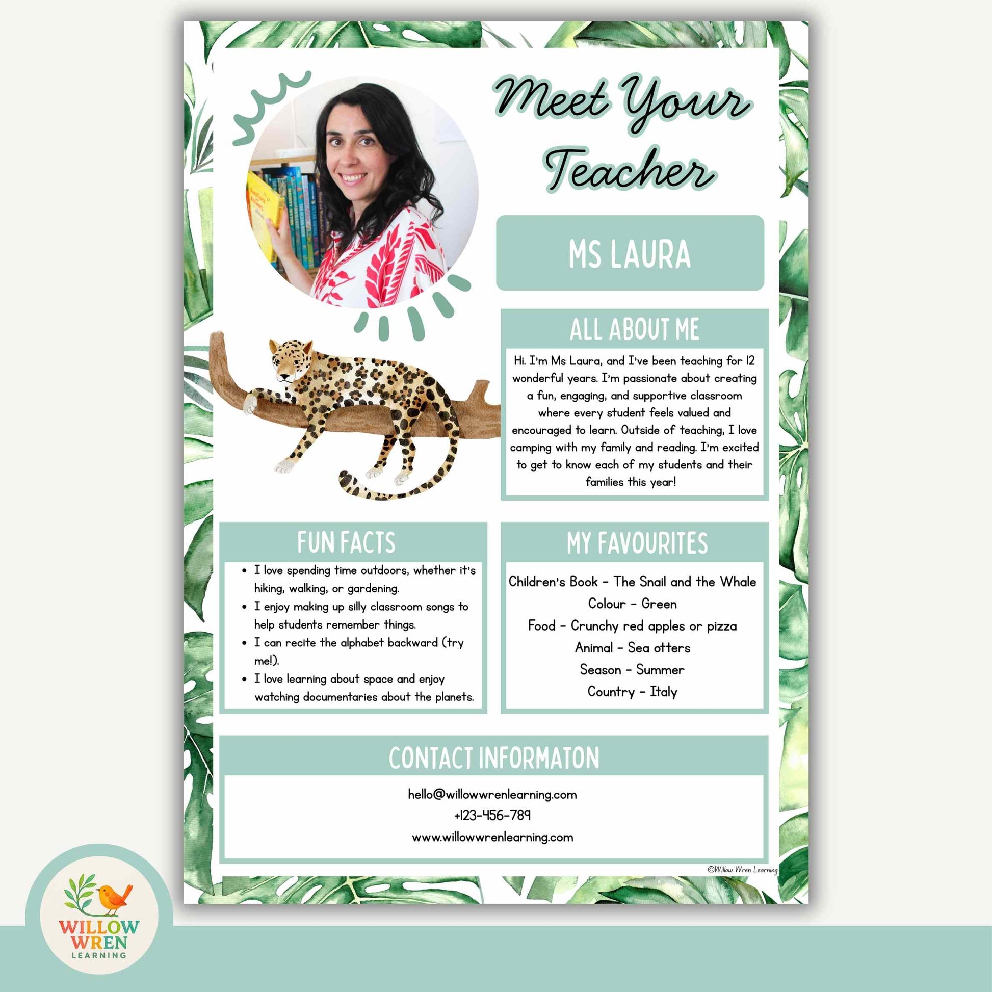 Featuring tropical greenery, friendly rainforest animals and soft nature-inspired colours, these templates help turn your back-to-school setup into an inviting learning space for students and families. Ideal for open house events, Meet the Teacher nights or the first week of school, this resource offers a professional yet approachable way to share information about you.