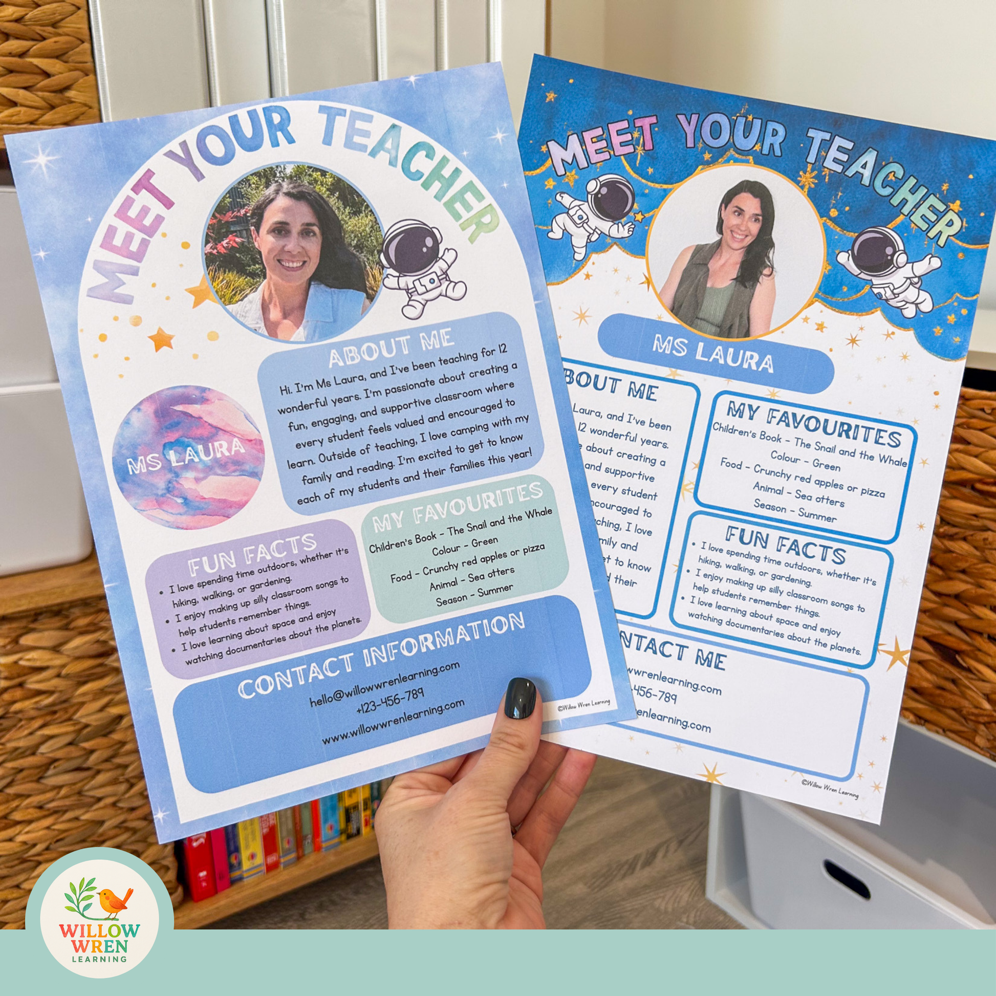 Featuring dreamy starry backgrounds, friendly space elements and soft cosmic colours, these templates help turn your back-to-school setup into an inviting learning space for students and families. Ideal for open house events, Meet the Teacher nights or the first week of school, this resource offers a professional yet approachable way to share information about you.
